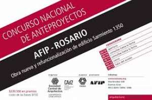 Concurso FinalizadoPresentaciónDescargar BasesGanadoresTodos los proyectosCronogramaCRONOGRAMAAPERTURA el 9 de octubre de 2008CIERRE el 10 de diciembre de 2008PREMIOSPrimer Premio: $ 170.000 Segundo Premio: $ 85.000 Tercer Premio: $ 42.500 Tres Menciones: $ 14.000 cada unaCONCURSO NACIONAL DE ANTEPROYECTOS DE ARQUITECTURA PARA LA OBRA NUEVA Y REFUNCIONALIZACION DEL EDIFICIO DEL AFIP ROSARIO¿Falta tu proyecto? ¿Participaste en uno y no aparece tu nombre? Escribínos