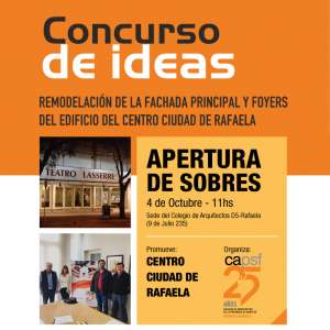 El Centro Ciudad de Rafaela, con domicilio en Bv. Lehmann 228, y el Colegio de Arquitectos de la Provincia de Santa Fe, Distrito 5, con domicilio en 9 de Julio 235, ambos de esta ciudad de Rafaela, denominados el Promotor y el Organizador respectivamente, llaman a Concurso de Ideas para la renovación de la fachada principal del edificio institucional del Promotor, y refuncionalización del Sector de Foyers de la sala principal “B. J. Lasserre”, y la sala secundaria “Luis Remonda”