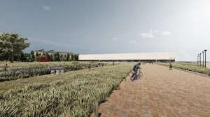 El emplazamiento se dispone paralelo a la ruta provincial N° 14 generando dos espacios públicos con escalas diferentes: un gran parque cargado de vegetación nativa y una plaza seca de menor escala para servir al futuro frente residencial.