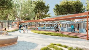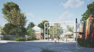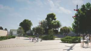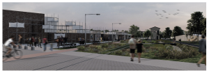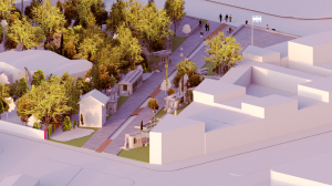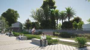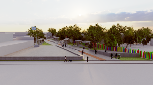 6. Dimensión ambiental y renaturalización:La dimensión ambiental es un componente estructural de la propuesta. Se promueve la renaturalización en los intersticios generados entre las semiplazas mediante la incorporación de espacios verdes con especies autóctonas, reforzando la biodiversidad, mejorando la resiliencia ecológica y generando corredores bioecológicos que actúan como filtros naturales de aire y ruido. Este diseño paisajístico busca recuperar el equilibrio ecológico en sus “habitaciones” y sus “patios” y revalorizar los servicios ecosistémicos del canal hídrico existente y del entorno ferroviario, convirtiéndolos en soporte de nuevas dinámicas ambientales y culturales.