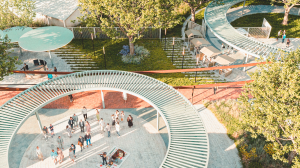 La propuesta organiza un recorrido que vincula todas las preexistencias y programas nuevos, generando un hilo narrativo que acompaña la experiencia del usuario. Caminar por el parque se convierte así en un acto de descubrimiento: el visitante reconoce las huellas ferroviarias, atraviesa espacios de encuentro, observa el paisaje desde el mirador, participa de actividades culturales en la casa de la esquina o disfruta de talleres en la plazoleta para las infancias. La propuesta no se limita a configurar un espacio verde, sino que ofrece un guion urbano donde cada pieza cobra un rol específico en la construcción de la memoria colectiva.