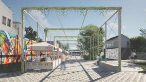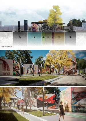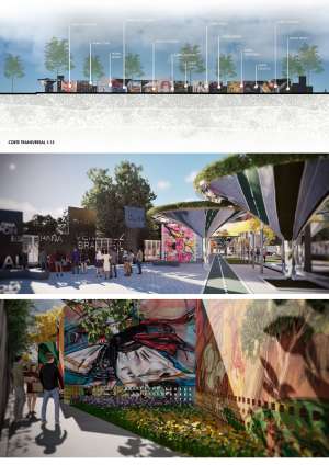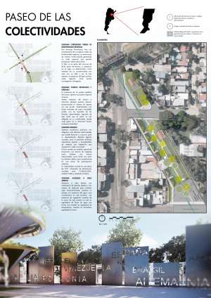 El Paseo de las Colectividades se concibe como un espacio público flexible y reversible que articula actividades culturales, comerciales y recreativas, tomando como referencia la experiencia anual de la feria homónima. La propuesta se desarrolla sobre un eje lineal que vincula ambos frentes del predio y se adapta al trazado ferroviario, a las bicisendas existentes y a la continuidad de las medianeras linderas. De esta manera transforma fachadas traseras inactivas en bordes activos, conteniendo nuevas funciones y espacios de permanencia.