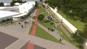 La propuesta se organiza en tres sectores principales: una plaza cívica, un espacio central con superficie de captación de aguas pluviales y un sector cultural presidido por una gran pérgola metálica con uniones desmontables. Un área complementaria, ubicada en el extremo norte, busca mejorar la integración con la Av. Aristóbulo del Valle y el Puente Negro. El diseño incorpora cruces peatonales, bicisendas y corredores de vegetación lineal, reforzando la conectividad y promoviendo la movilidad sustentable.