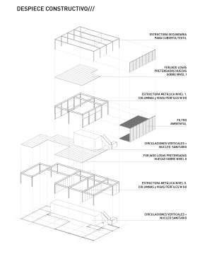 Apelando a un edificio austero, se priorizan los medios de control climáticos pasivos, utilizando filtros ambientales que atemperan y reducen los factores climáticos de acuerdo a las orientaciones. Al mismo tiempo una estructura clara configura la matriz del edificio, exponiendo los recursos y materiales empleados, exaltando la métrica que define la estructura y aportando la flexibilidad necesaria de acuerdo a los diferentes usos. A fin de construir un sistema lógico, se emplea una estructura metálica de perfiles normales para columnas y vigas y losas conformadas por elementos pretensados de fácil montaje en obra a fin de optimizar al máximo los tiempos de ejecución.